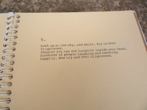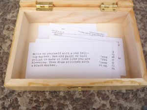 The therapy exercises thus become scores by being presented as such: they are collected in a handmade workbook and as cards in a box inspired by Brecht’s Water Yam. They are presented as literature and as an art object, imitating in both cases traditional ways to display event scores.